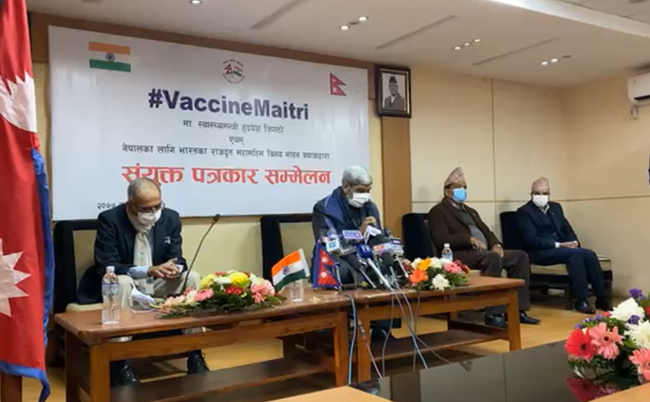 बुधबार नेपाल र भारत सरकारले संयुक्त रुपमा आयोजना गरेको पत्रकार सम्मलेनमार्फत बोल्दै स्वास्थ्य तथा जनसंख्यामन्त्री हृदश त्रिपाठीले भारत सरकारले अनुदानमा १० लाख डोज खोप नेपाललाई प्रदान गरेको बताएका छन् ।