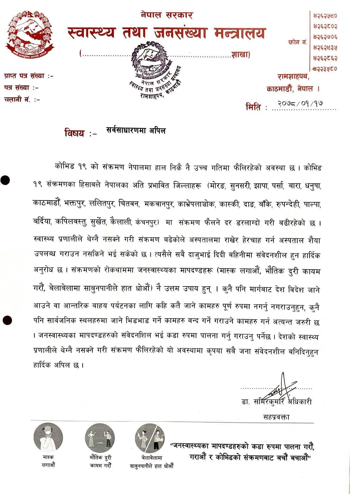 १७ बैशाख २०७८ मा सार्वजनिक सुचना जारी गर्दै स्वास्थ्य मन्त्रालयका सह–प्रवक्ता डा. समिरकुमार अधिकारीले सर्वसाधारणलाई बढ्दो संक्रमणका बीच संवेदनशिल रहन आग्रह गरेका हुन् ।