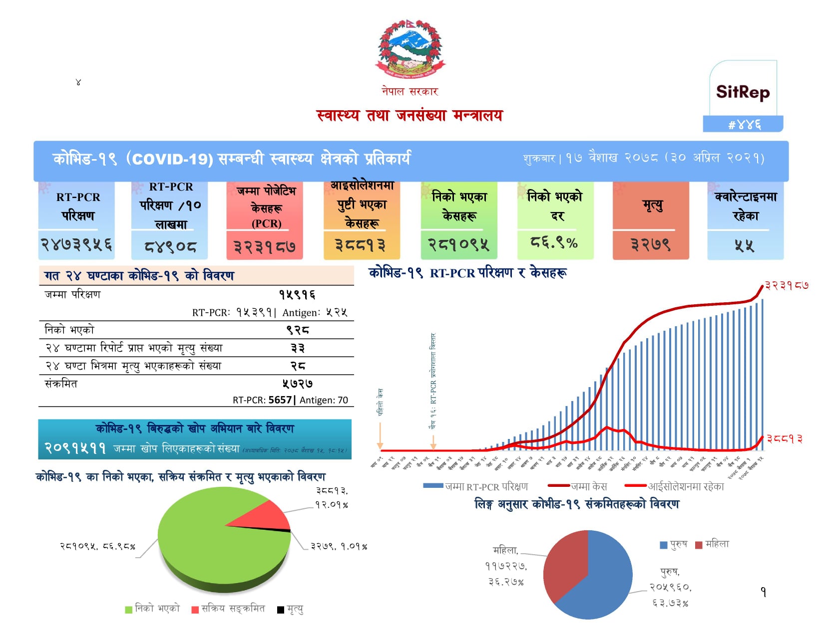 १७ बैशाखमा स्वास्थ्य मन्त्रालयले प्रेस विज्ञप्ती जारी गर्दै पछिल्लो २४ घण्टामा मुलुकभर ५ हजार ७२७ व्यक्ति कोरोना संक्रमित भएका छन् ।