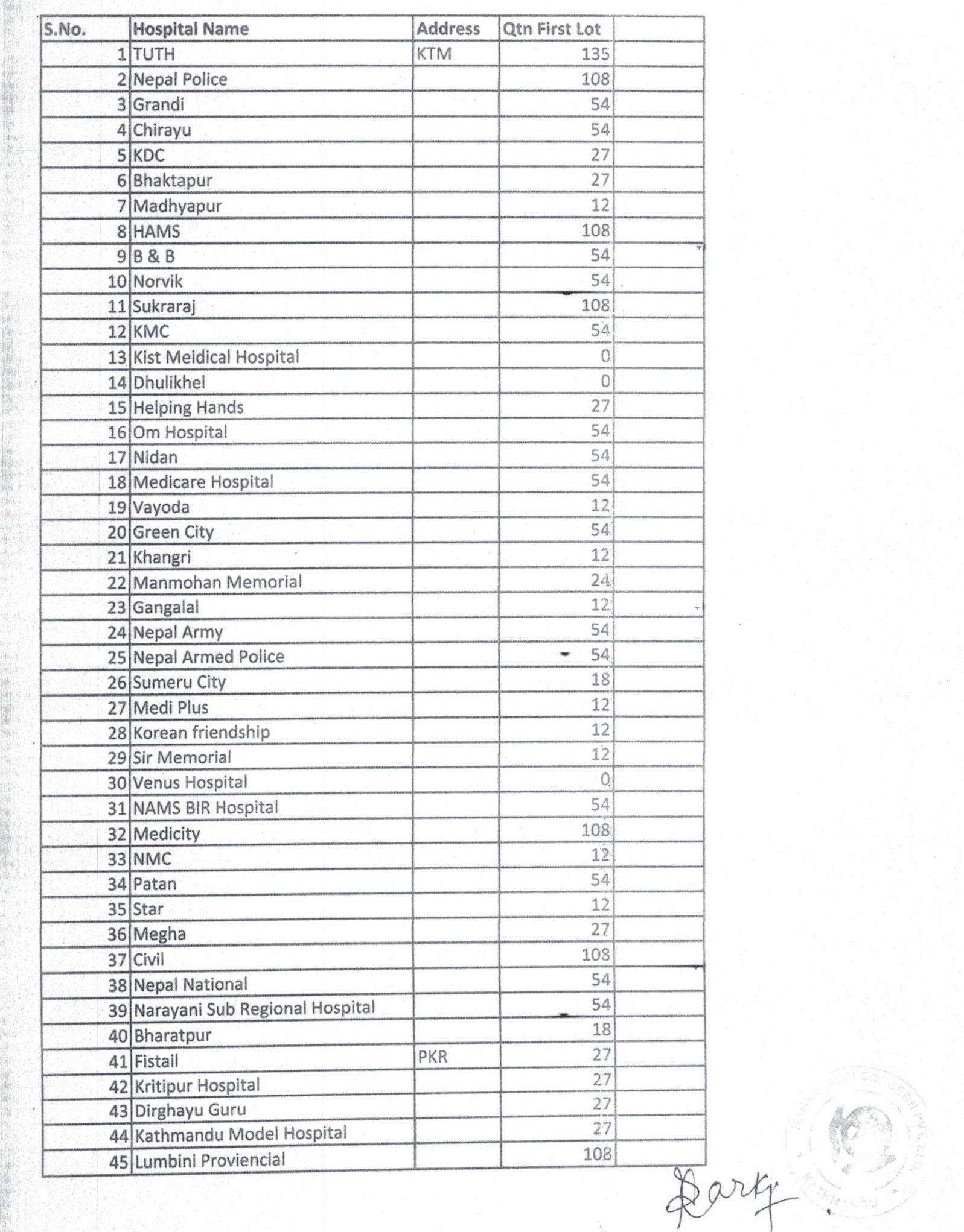 रेमडिसिभिर औषधी वितरण गरिने अस्पतालहरुको सूची