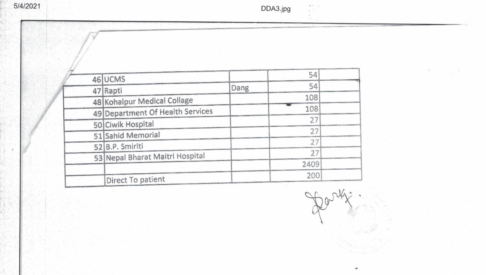 सरकारले २१ बैशाख २०७८ मा कोरोना संक्रमितको उपचारमा उपयोगी देखिएको तीन हजार भायल एन्टीभाइरल रेमडिसिभिर औषधी नेपाल भित्र्याएर अस्पतालहरुलाई वितरण गर्न थालेको छ ।