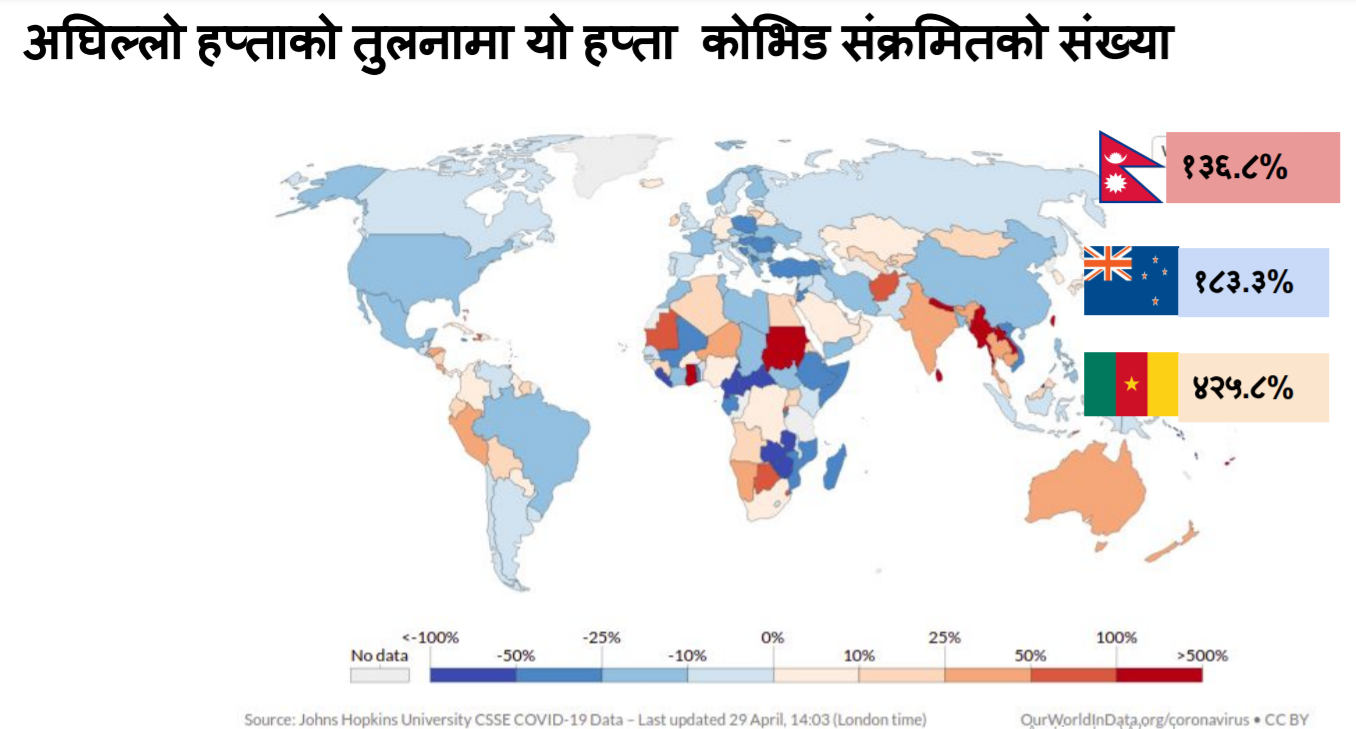 जनस्वास्थ्य विज्ञ तथा धुलिखेल अस्पतालका जनस्वास्थ्य तथा सामुदायिक कार्यक्रम प्रमुख डा. विराज कर्माचार्यले अघिल्लो हप्ताको तुलनामा गत हप्ता(पछिल्लो सात दिन) यो हप्ता मुलुकमा कोरोना भाइरसको संक्रमण १३७.८ प्रतिशतले बृद्धि भएको बताए ।