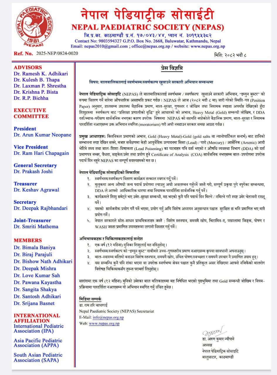 नेपाल पेडियाट्रिक सोसाइटी (NEPAS) ले समेत विज्ञप्ति निकाल्दै कार्यक्रम तत्काल रोक्न र प्रमाणमा आधारित पुनरवलोकन गर्न माग गरेको छ।